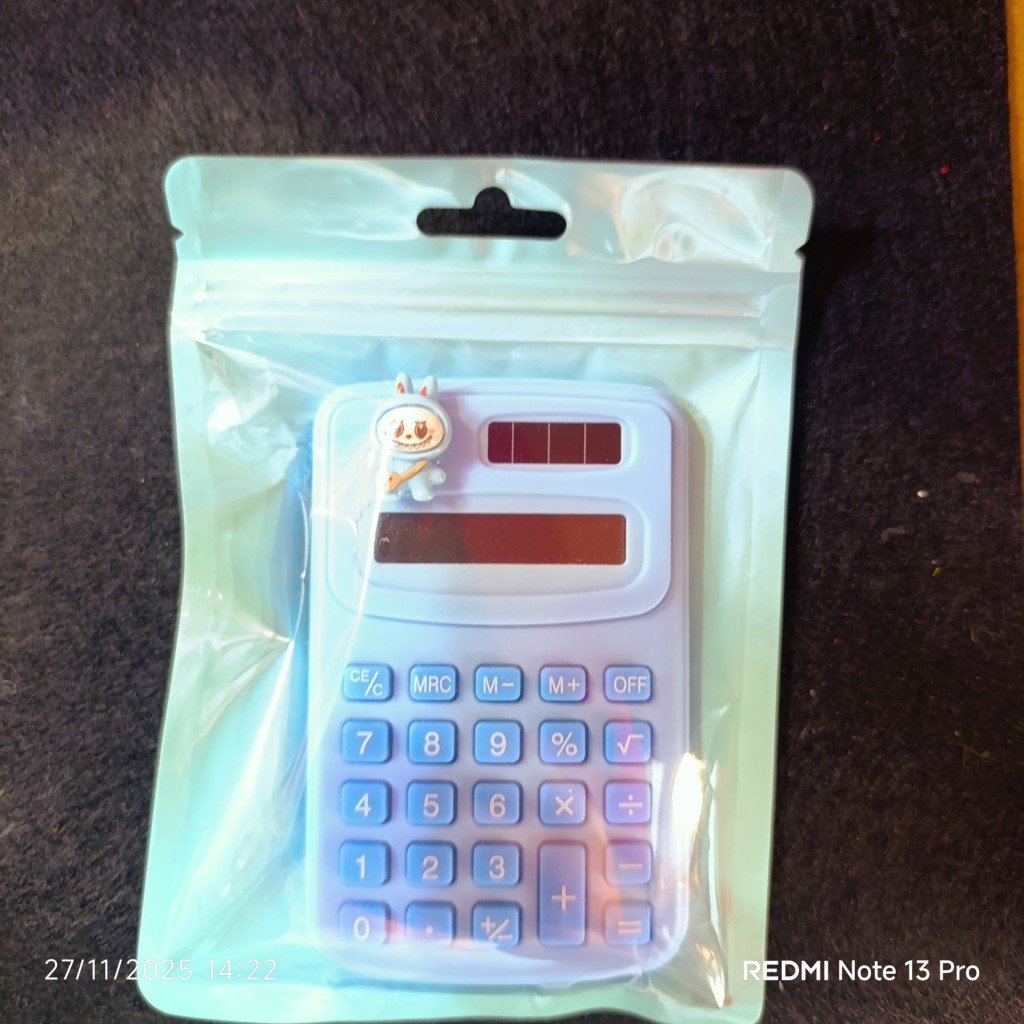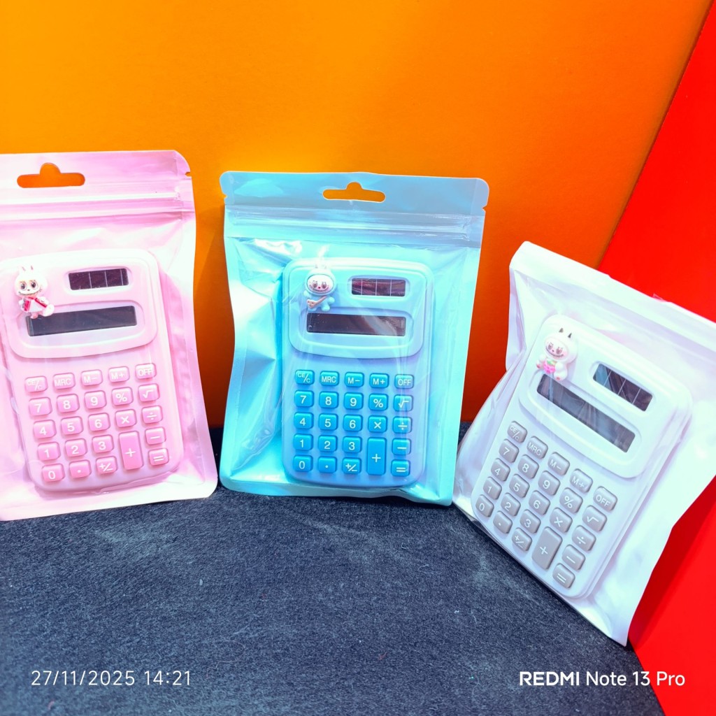 ماشینحساب فانتزی عروسکدار لبوبو؛ طراحی بامزه و رنگی با عروسک کوچک روی بدنه، مناسب میز کار یا مدرسه. کلیدهای نرم، نمایشگر واضح و گزینهای جذاب برای هدیه.
